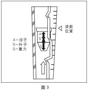 當(dāng)升力S與浮力A之和等于浮子自身重力G時,浮子處于平衡,穩(wěn)定在某一高度位置上,錐管上的刻度指示流體的流量值。如下圖(圖3)。
